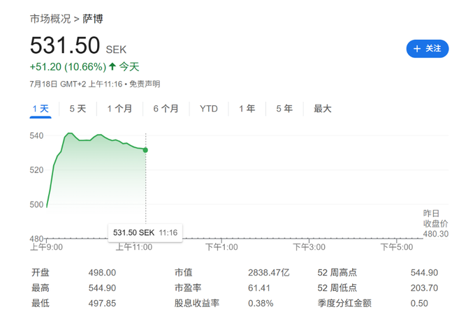欧洲国防材料制造商萨博(Saab)公司周五公布的第二季度运营收益超出市场预期,并上调了全年销售指引。