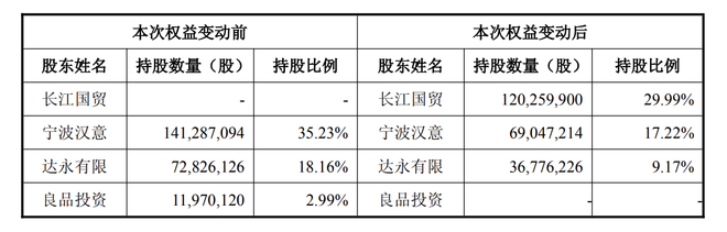 本次股权转让前,公司控股股东宁波汉意及其一致行动人良品投资合计持有良品铺子股份总数的38.22%。转让后,宁波汉意及其一致行动人良品投资合计持有良品铺子股份减少,约占上市公司股份总数的17.22%,长江国贸将持有良品铺子股份总数的21%。