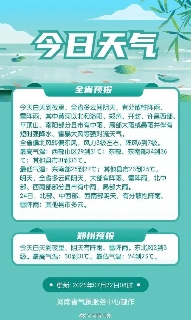 省气象台预计,22日白天到夜里,全省多云间阴天,有分散性阵雨、雷阵雨,其中黄河以北和洛阳、郑州、开封、许昌西部、平顶山、南阳部分县市有中雨,局部大雨或暴雨并伴有短时强降水、雷暴大风等强对流天气。