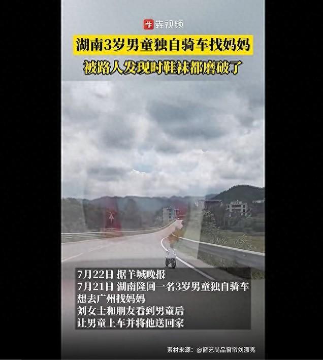 7月21日,湖南隆回一名3岁男童独自骑车想去广州找妈妈。刘女士和朋友看到男童后,让男童上车并将他送回家。刘女士称,她看到男童一个人在路上骑车不安全,问了才知道他要去广州找妈妈,当时鞋子袜子都磨破了,她把男童哄上车后,找了一个多小时才将他送回家中。