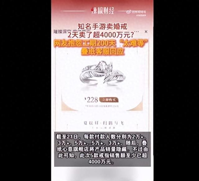 恋与深空婚戒在短短两天内售罄,销售额达到四千万,网友纷纷吐槽该婚戒的两百天工期太难等待,客服回应表示,由于产品手工制作和工序复杂,导致制作时间较长,尽管有网友认为等待时间过长,但仍有消费者选择购买并期待收到这款独特的婚戒。