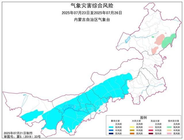 预计7月23日至26日,内蒙古阿拉善盟西南部和东部部分地区、乌海市、巴彦淖尔市南部、鄂尔多斯市大部、包头市大部、呼和浩特市中部和北部、乌兰察布市大部、锡林郭勒盟中部和南部、赤峰市西部有暴雨气象灾害低风险(图2)。