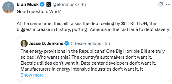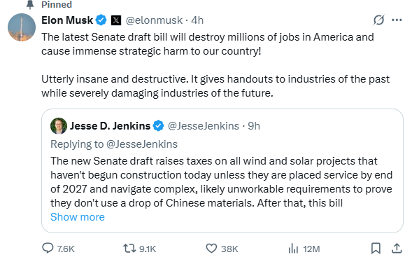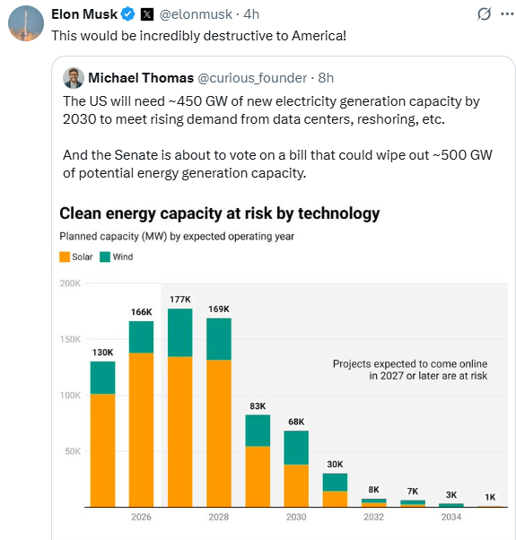 北京时间6月29日,马斯克在社交媒体上X上称,削减电动车和其他清洁能源补贴,对美国将是极具破坏性的: