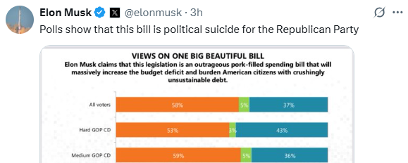 马斯克再批“大漂亮”法案:共和党政治自杀