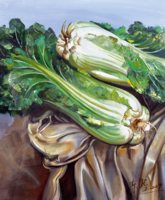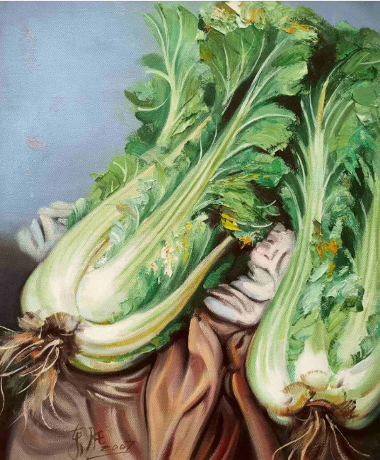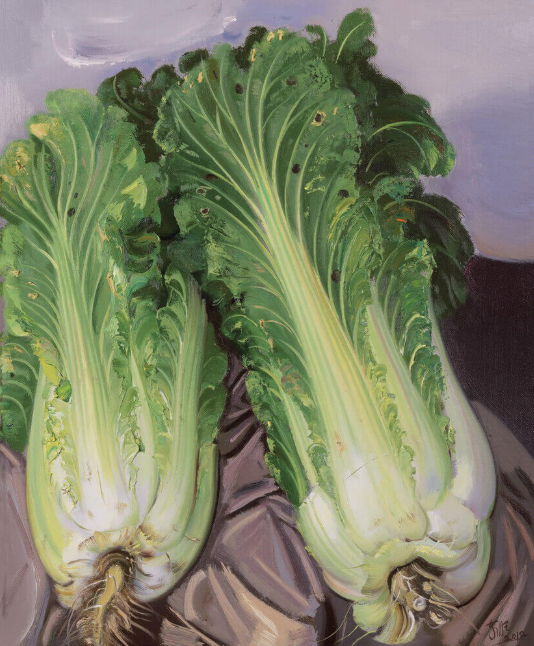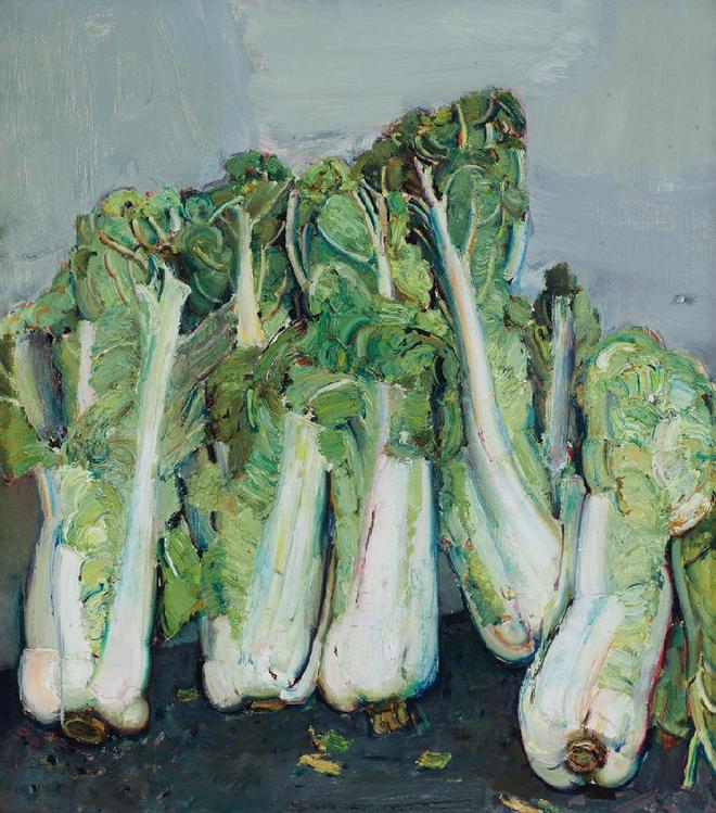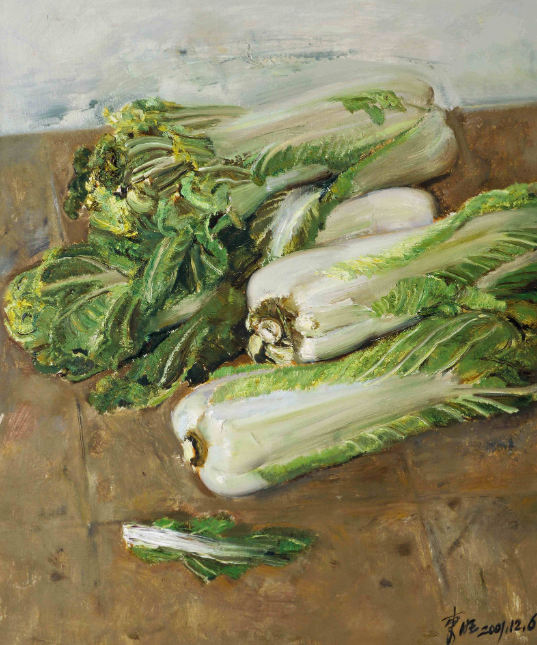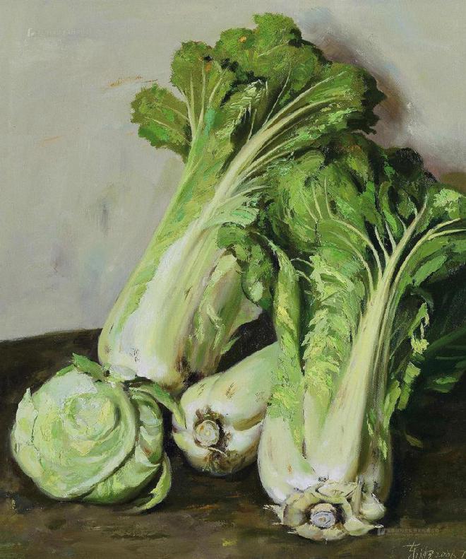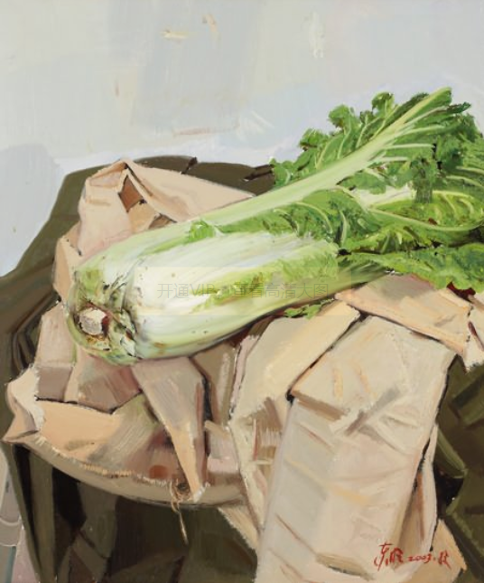 他笔下的白菜堪称这种美学的结晶。2012年拍出51.75万元的《白菜》中,发黄的烂叶与紧裹的菜心形成对比。没有古典静物的完美无瑕,只有生命本真的朴素尊严——“就像自己的一生,有波折、落寞和痛苦”。当超写实大师冷军赞叹此作为“天下第一白菜”时,背后是对一个艺术家将民族气质注入油画语言的致敬。