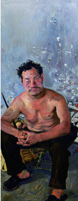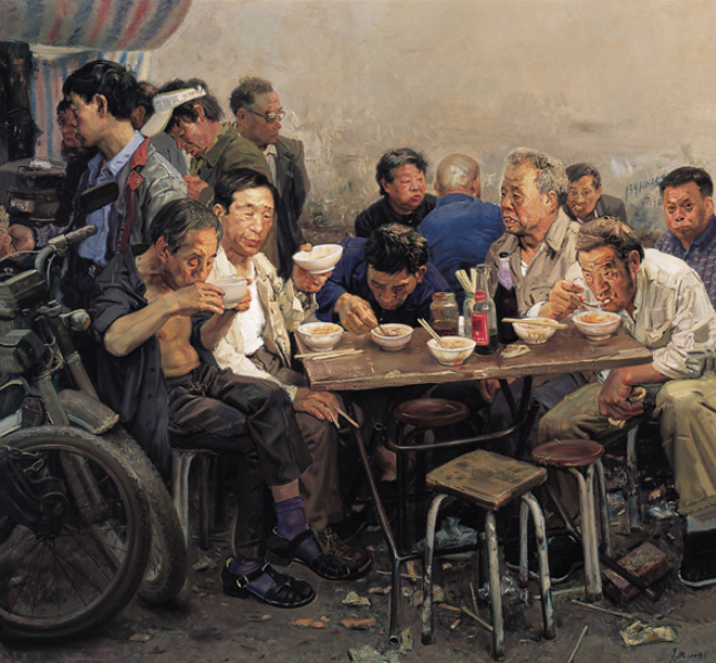 忻东旺拒绝将艺术沦为苦难的传声筒。在《早点》(2004)中,晨光微熹的街边摊前,农民工捧着热气腾腾的碗,嘴角的馒头渣、冻红的指关节、油腻的棉外套,每一处笔触都在诉说生存的艰辛,但热气蒸腾中却升腾着温暖的烟火气。他擅长在人物细节中发掘人性的闪光:《卖桃人》狡黠的眼神、《戴哈萨克花帽的维吾尔族老人》褶皱里的沧桑、《装修》中工人沾满涂料的双手——这些形象不是符号化的“底层”,而是带着体温的“人”。正如他所坚持:“艺术不是来直接报道生活的...每当我们浏览新闻媒体的时候,总是能看到这样那样的苦难,但是艺术不是来直接报道生活的。”