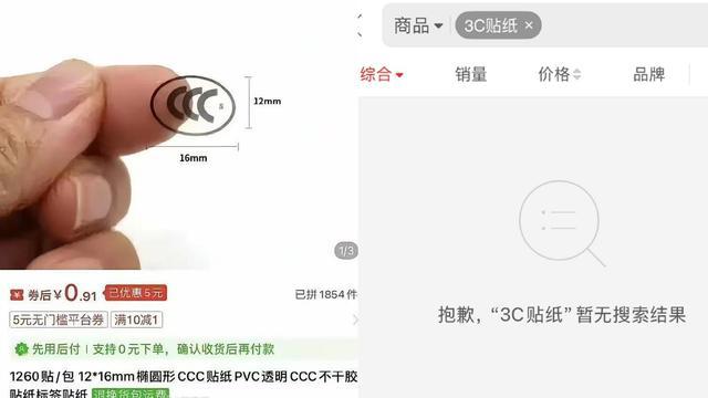 与此同时,都市现场报道,购物平台上竟有商家售卖3C认证标签贴纸,相关截图显示,只需要几元钱,就能买到上千张贴纸。业内人士透露,这类贴纸多由无资质厂商仿制,盗用证书编号,消费者贴上后涉嫌“冒用认证标志”。