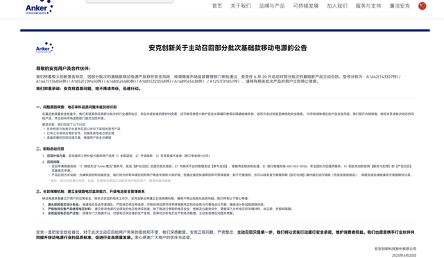 近期,充电宝安全问题引发社会广泛关注。6月20日,@安克创新 发布关于主动召回部分批次基础款移动电源的公告。公告称,因部分批次的基础款移动电源产品存在安全风险,经国家市场监督管理部门6月20日批准,安克即日起主动对型号为A1642/A1647/A1652/A1680/A1681/A1689/A1257的部分批次产品发起召回,请持有相关产品的用户立即停止使用。
