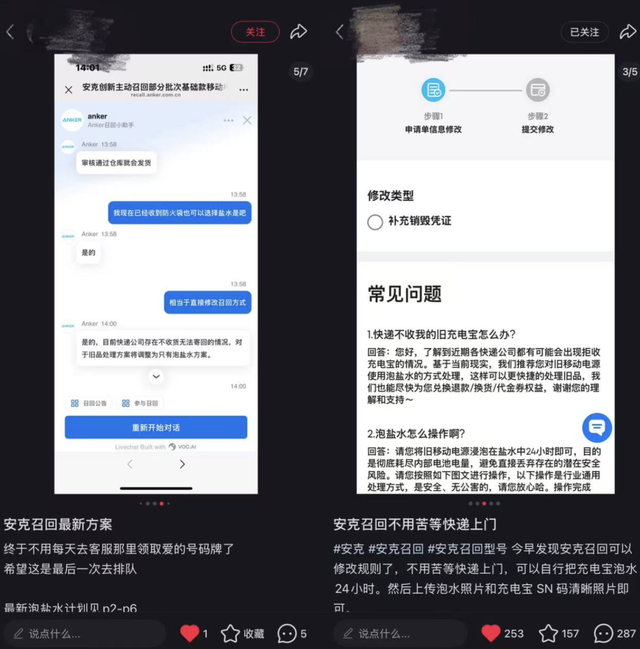 6月29日,社交媒体上有用户发文表示,安克提供了新的召回方案,只需自行把充电宝泡盐水24小时,然后上传泡水照片和充电宝SN码清晰照片即可。客服回应称,目前快递公司存在不收货无法寄回的情况,对于旧品处理方案将调整为泡盐水方案。