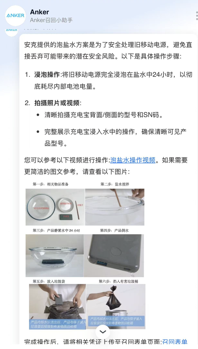 对此,记者从安克召回助手账号了解到,官方确实提供了新的泡盐水方案,并提供了详细的演示过程。