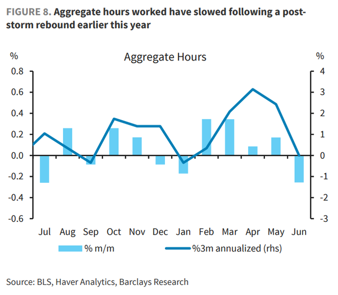 巴克莱还发现,6月薪资增长放缓,平均工作时长减少,导致薪资收入增长陷入停滞,令人担忧消费支出。