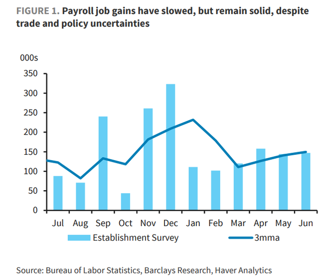 巴克莱预计失业率将在第三季度见顶于4.3%,年底前月度就业增长将放缓至7.5万个,主要受关税和移民政策对经济活动和招聘的影响。该行称: