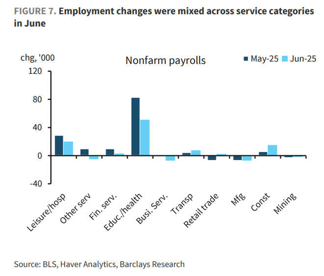 服务业内部,教育和医疗服务增加5.1万个岗位,休闲和酒店服务增加2万个,但专业和商业服务减少0.7万个岗位。巴克莱认为,这种分化反映出经济结构调整的复杂性。