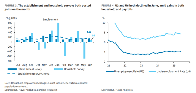 报告称,6月非农就业报告的标题数字确实亮眼,新增就业14.7万个,超出巴克莱10万个和市场共识10.6万个的预期。而且,三个月移动平均值达到15万个,较去年同期的13万个有所提升。