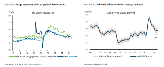巴克莱的状态空间模型显示,潜在月度薪资增长率为0.27%,折合年化增长率3.3%,与前几个月基本持平。
