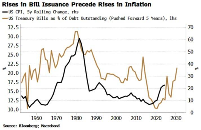 从短期看,财政部转向更多发行短期国债将刺激风险资产价格进一步脱离长期公允价值,并在结构上推高通胀水平