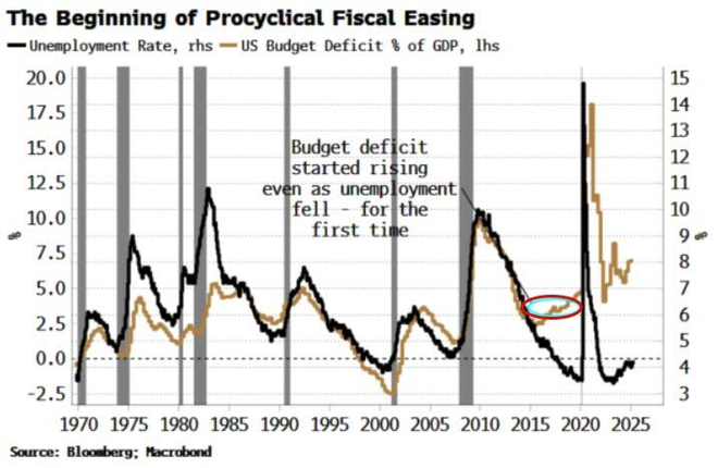 本轮通胀周期的抬头,其先兆便是2010年代中期开始的国库券发行量回升,当时美国财政赤字首次出现顺周期增长。