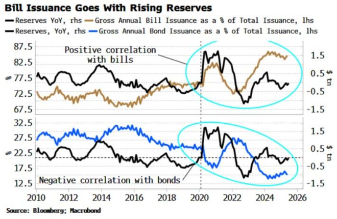 此外观察显示,短期国库券的发行量与美联储准备金的增长通常呈正相关,尤其是在疫情之后;而长期债券的发行则与准备金呈负相关。简而言之,发行更多长债会挤压流动性,而发行更多短债则会增加流动性