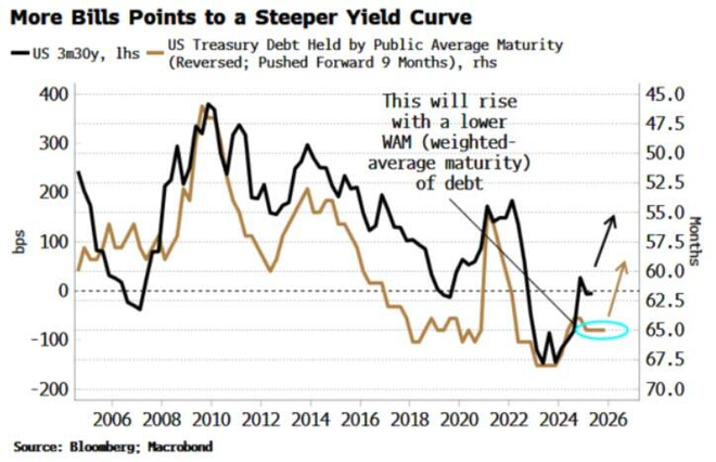 值得注意的是,这一转变对市场的长期影响将是深远的。首先,美元将成为牺牲品。其次,随着政府债务加权平均期限的缩短,收益率曲线将趋于陡峭化,这意味着长期融资成本将变得更加昂贵