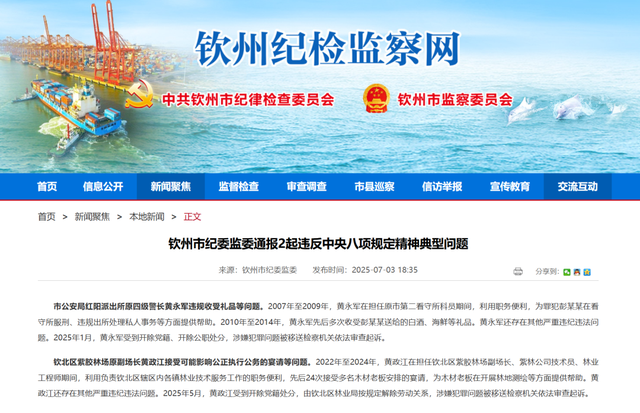 钦州市公安局红阳派出所原四级警长黄永军违规收受礼品等问题。2007年至2009年,黄永军在担任原市第二看守所科员期间,利用职务便利,为罪犯彭某某在看守所服刑、违规出所处理私人事务等方面提供帮助。2010年至2014年,黄永军先后多次收受彭某某送给的白酒、海鲜等礼品。黄永军还存在其他严重违纪违法问题。2025年1月,黄永军受到开除党籍、开除公职处分,涉嫌犯罪问题被移送检察机关依法审查起诉。