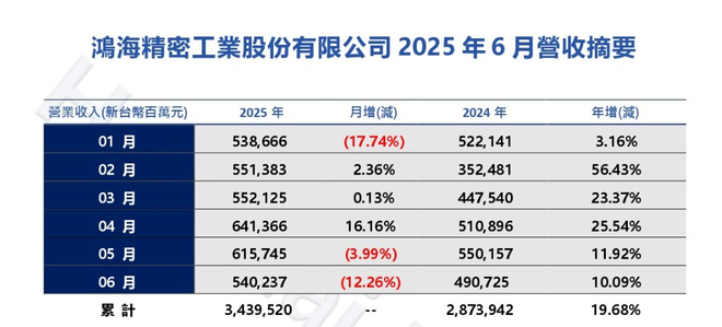7月5日,鸿海精密公布数据显示,受益于AI服务器和iPhone强劲需求推动,公司二季度营收同比增长15.8%,达到新台币1.8万亿元,基本符合市场预期,预计下一季度营收将实现环比和同比双增长。