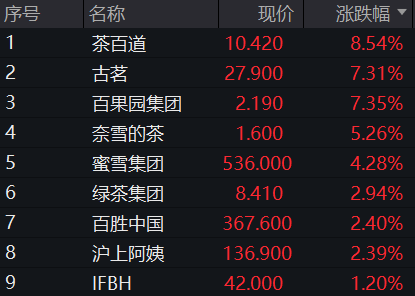 茶饮股强势反弹,茶百道、古茗一度涨超10%,蜜雪集团涨超4%。