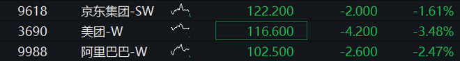 港股科网股下跌,京东、美团、阿里巴巴等跌幅居前,截止发稿,分别下跌1.61%、3.48%和2.47%。