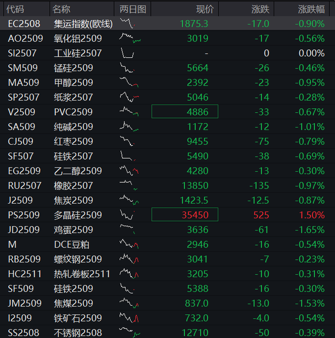 国内期货主力合约多数下跌。合成橡胶跌超2%,20号胶、SC原油、集运欧线跌近2%。涨幅方面,棉花涨0.44%。