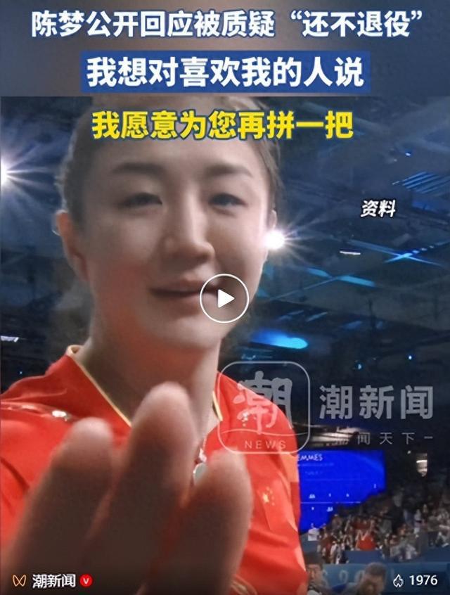 陈梦回应退役质疑,表示愿意为支持者再拼一把,她表示,自己不会轻易放弃,将继续坚持努力,为支持和热爱她的观众呈现更好的表现,陈梦深知运动员生涯的不易,但她表示会珍惜每一次比赛机会,尽全力拼搏,为自己和支持者争取更好的成绩和荣誉,她的坚定决心和勇气令人钦佩。