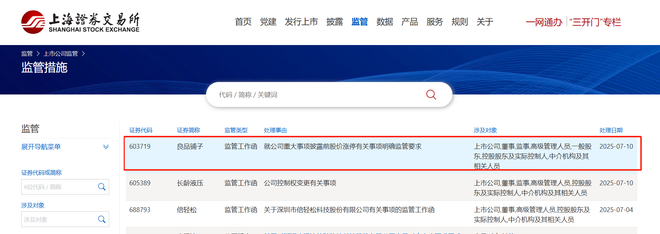 7月10日晚间,上交所对良品铺子发出监管工作函,就公司重大事项披露前股价涨停有关事项明确监管要求,涉及上市公司、董事、监事、高级管理人员、一般股东、控股股东及实际控制人、中介机构及其相关人员。