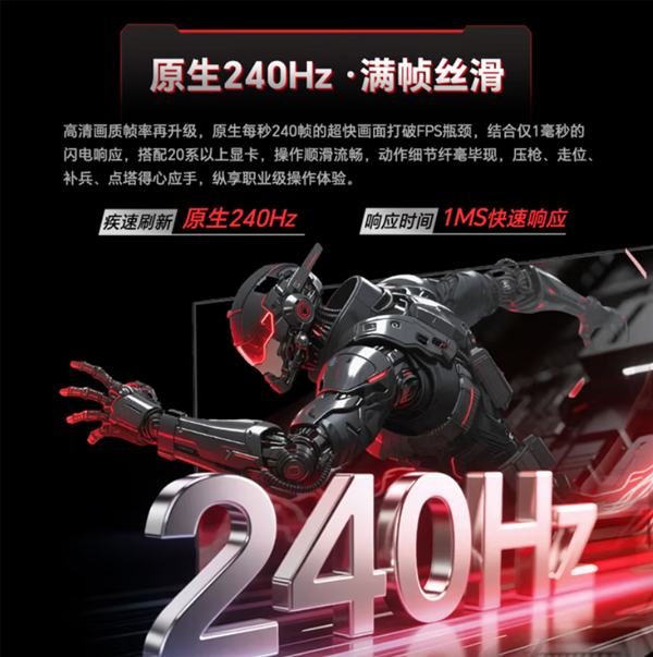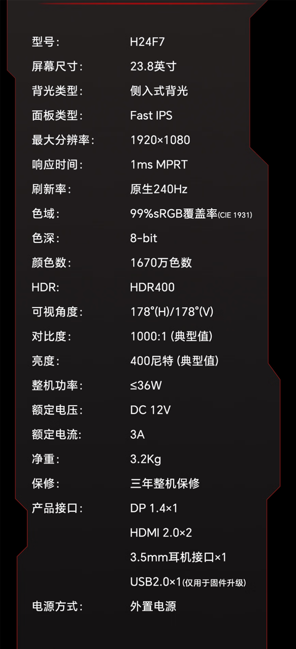 这款显示器配备了23.8英寸Fast-IPS面板,拥有1080P分辨率和240Hz的原生刷新率,响应时间1ms MPRT和2ms GTG。