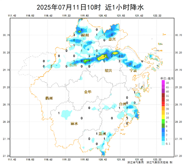 浙中南和沿海等地部分有中到大雨,局部暴雨。