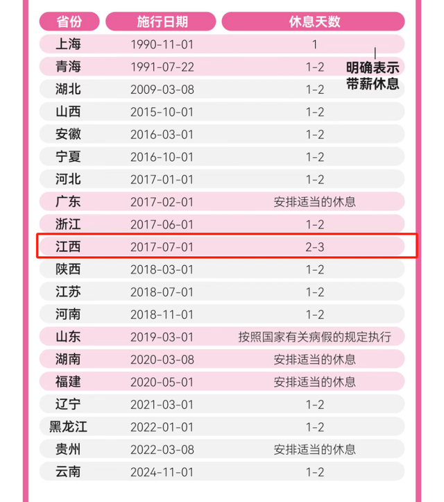 记者搜索后发现,《江西省女职工劳动保护特别规定》第八条中明确规定:对从事低温、冷水、野外流动、建筑作业和三级以上高处作业、三级以上体力劳动强度作业的女职工,用人单位在其月经期间应当调整安排其他劳动或者安排休息二至三天。在月经期休息期间,工资和福利待遇不变。