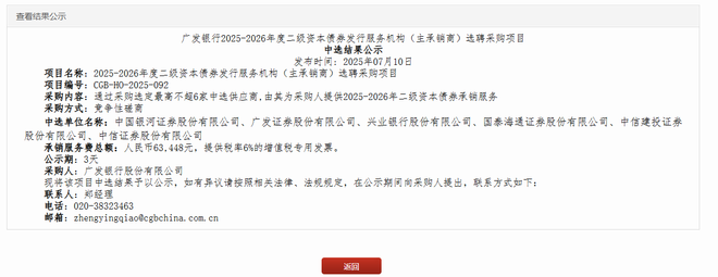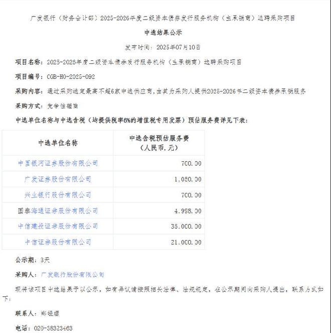 7月10日,本次选聘采购项目的中选结果出炉。据广发银行供应商服务平台信息,前述6家金融机构中标广发银行债券承销服务,承销服务费总额仅为人民币63448元,提供税率为6%的增值税专用发票。