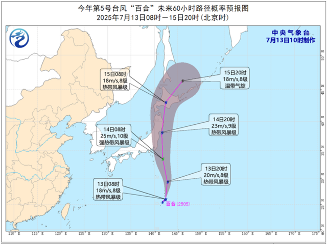 预计,“百合”将以每小时30~35公里的速度向偏北方向快速移动,强度逐渐加强,并向日本东部一带沿海靠近。未来“百合”对我国无影响。