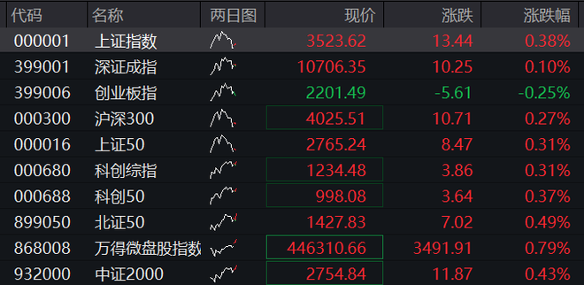 A股:截止发稿,沪指涨0.38%,深成指涨0.10%,创业板指跌0.25%。![]()