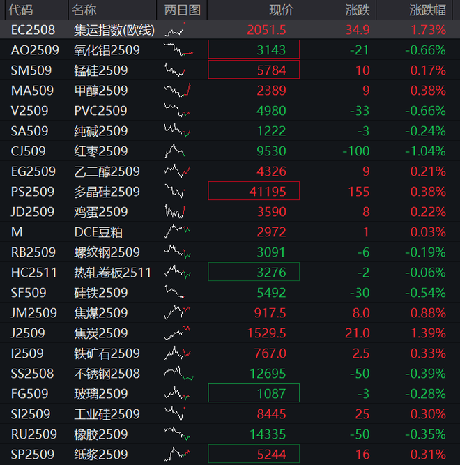 国内期货主力合约涨跌不一,沪银、SC原油涨超2%,焦炭、焦煤、烧碱、低硫燃料油(LU)涨超1%。跌幅方面,淀粉、玉米、硅铁跌超1%。