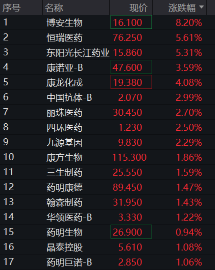 医药股再度走强,创新药方向反弹,博安生物、恒瑞医药、东阳光长江药业等涨幅居前。