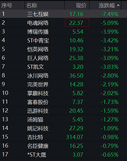 游戏板块震荡下挫,三七互娱逼近跌停,电魂网络跌超6%,新迅达、恺英网络、冰川网络、完美世界等跌幅靠前。