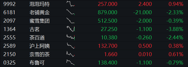 港股新消费概念调整,茶饮股等跌幅居前,古茗、茶百道跌超2%,蜜雪集团也走低。