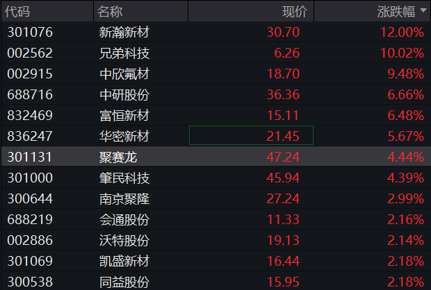 机器人、PEEK材料概念股震荡走高,中欣氟材、兄弟科技涨停,新瀚新材涨超10%,中大力德、石头科技、中研股份、富恒新材、华勤技术等涨超5%。
