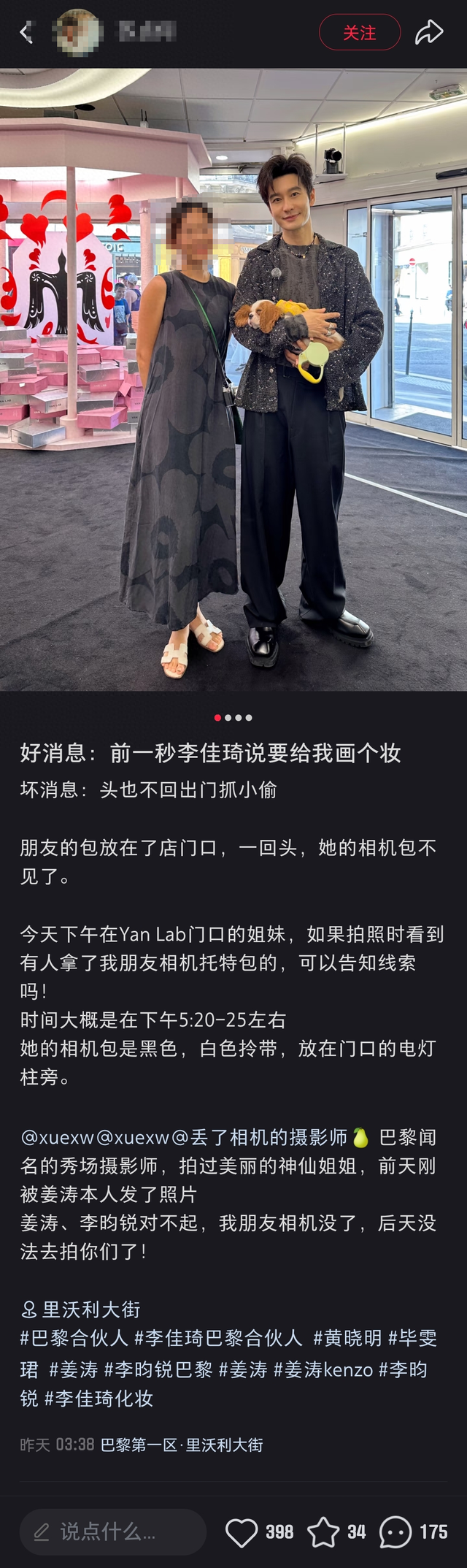 有网友晒文表示自己的摄影师朋友在巴黎丢了一台贵重的相机,随后被偶遇的黄晓明得知此事后,立刻掏出100欧元(约人民币840元)塞给了摄影师。