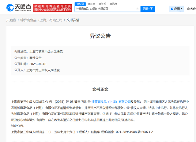 据媒体报道,最近有消费者发现,曾经的网红雪糕钟薛高如今却很难再见到身影。有记者探访多家超市都没有找到钟薛高在售,其线上官方店铺只剩下3款雪糕,各种冷饮批发店铺也只有2种口味。天眼查深度风险信息显示,7月16日,钟薛高食品(上海)有限公司新增一则破产审查信息,申请人为上海臻料贸易有限公司,经办法院为上海市第三中级人民法院。案件异议公告显示,因上海市杨浦区人民法院在执行中发现钟薛高食品(上海)有限公司不能清偿到期债务,并且资产不足以清偿全部债务,经债权人申请,法院中止执行,并将该案件移送本院进行破产立案审查。如有异议,应在收到本通知之日起七日内向法院书面提出并附相关证据材料。钟薛高食品(上海)有限公司成立于2018年3月,法定代表人为林盛,注册资本约12.03亿人民币,经营范围含食品销售、食用农产品零售、日用百货销售、工艺美术品及礼仪用品销售、互联网销售、餐饮管理、企业管理咨询等,由Gloryseed HK Limited全资持股。风险信息显示,该公司现存多条被执行人、限制消费令、失信被执行人(老赖)及终本案件信息。此前,钟薛高旗下钟茂(上海)食品科技有限公司、盘箸有喜(上海)生物科技有限公司均被申请破产审查。