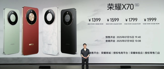 目前,荣耀X70已全面开启预售,并将于2025年7月18日10:08在荣耀商城、各大授权电商、荣耀体验店、授权零售门店正式开售。