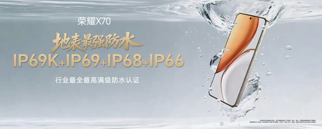 荣耀X70搭载荣耀自研三层防水架构让防护再升级,不仅具备IP69、IP68和IP66旗舰级顶配防水能力,还是主流厂商首款通过IP69K工业级防水认证的机型,构建起IP69K+IP69+IP68+IP66四重防护体系,率先实现行业航海级密封防护。整机具备应对高温高压冲洗、深水浸泡、暴雨泼溅等多种复杂场景能力,实现6米防护深度,85℃热水防护,18种液体抗侵蚀及30天浸水(1米)稳定运行,全面刷新主流手机防水标准。