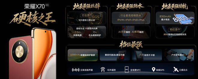 荣耀X70硬核亮相:2.5米抗摔IP69K防水8300mAh续航