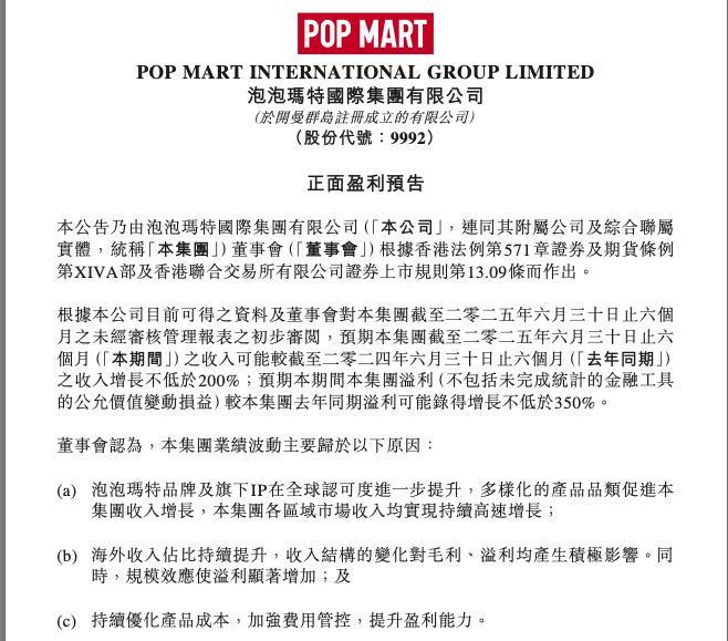 7月15日,泡泡玛特发布公告,预期集团截至2025年6月30日止六个月的收入可能较去年同期的收入增长不低于200%;预期本期间集团溢利(不包括未完成统计的金融工具的公允价值变动损益)较集团去年同期溢利可能录得增长不低于350%。