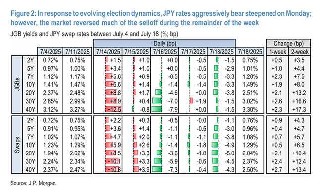 摩根大通在7月18日的报告中认为,当前日本市场已经消化了执政联盟将在周日选举中失去多数席位的预期。更进一步,市场正在定价一种更为复杂的政治情景——执政联盟可能不寻求扩大联合,而是选择组建一个少数派政府。