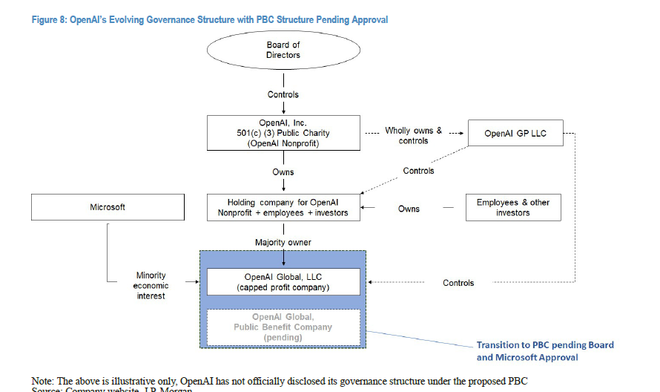 目前,OpenAI已宣布计划从“有限盈利公司”转型为结构更简单的“公益公司”(PBC),但需要董事会和主要投资者(尤其是持有少数经济权益的微软)的同意。
