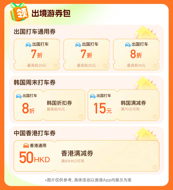 即日起至7月31日,用户打开滴滴App或小程序进入海外出行活动页面,可领海外打车专属券包,包含2张7折券,每张最高减20元以及1张8折券最高可抵10元;去往韩国旅游的用户可领2张韩国专属打车券,包含1张满70元减15元券和1张8折最高抵扣10元券,限周六日可用;去往日本的用户可以通过兑换码OTOKU兑换10张优惠券,单笔订单最高减500日元;订单起点或终点在东京国际机场、成田国际机场、关西国际机场的订单可享7折起优惠,单笔订单最高减1500日元;去香港游玩的用户可领最高减50港元的优惠券。此外,用户可参与抽奖赢好礼活动,每人每日有2次抽奖机会,奖品包含打车折扣券、立减券等,不同国家或地区可享优惠不同,用户可进入活动页面查看具体优惠详情。